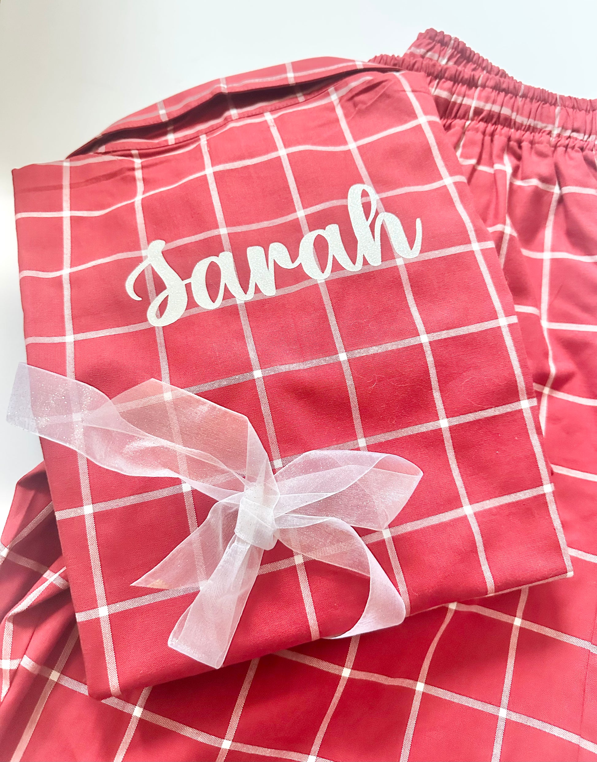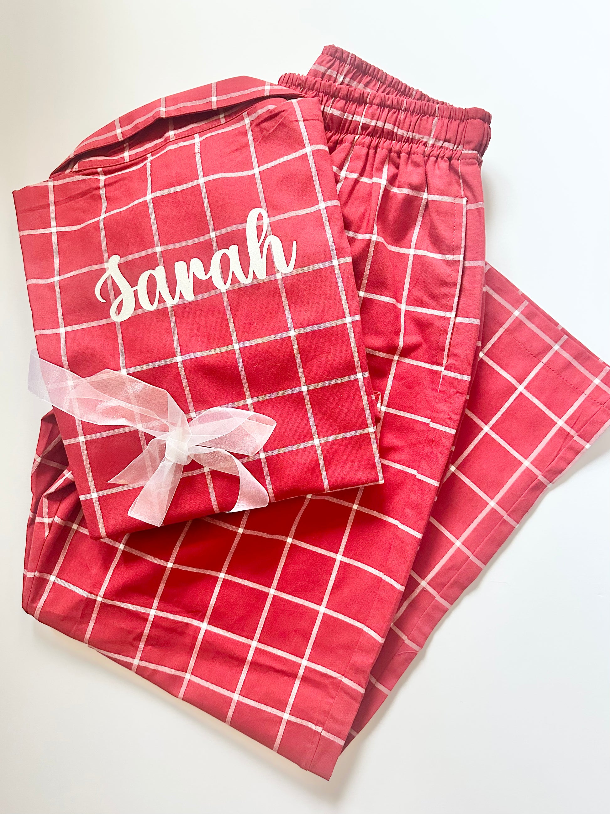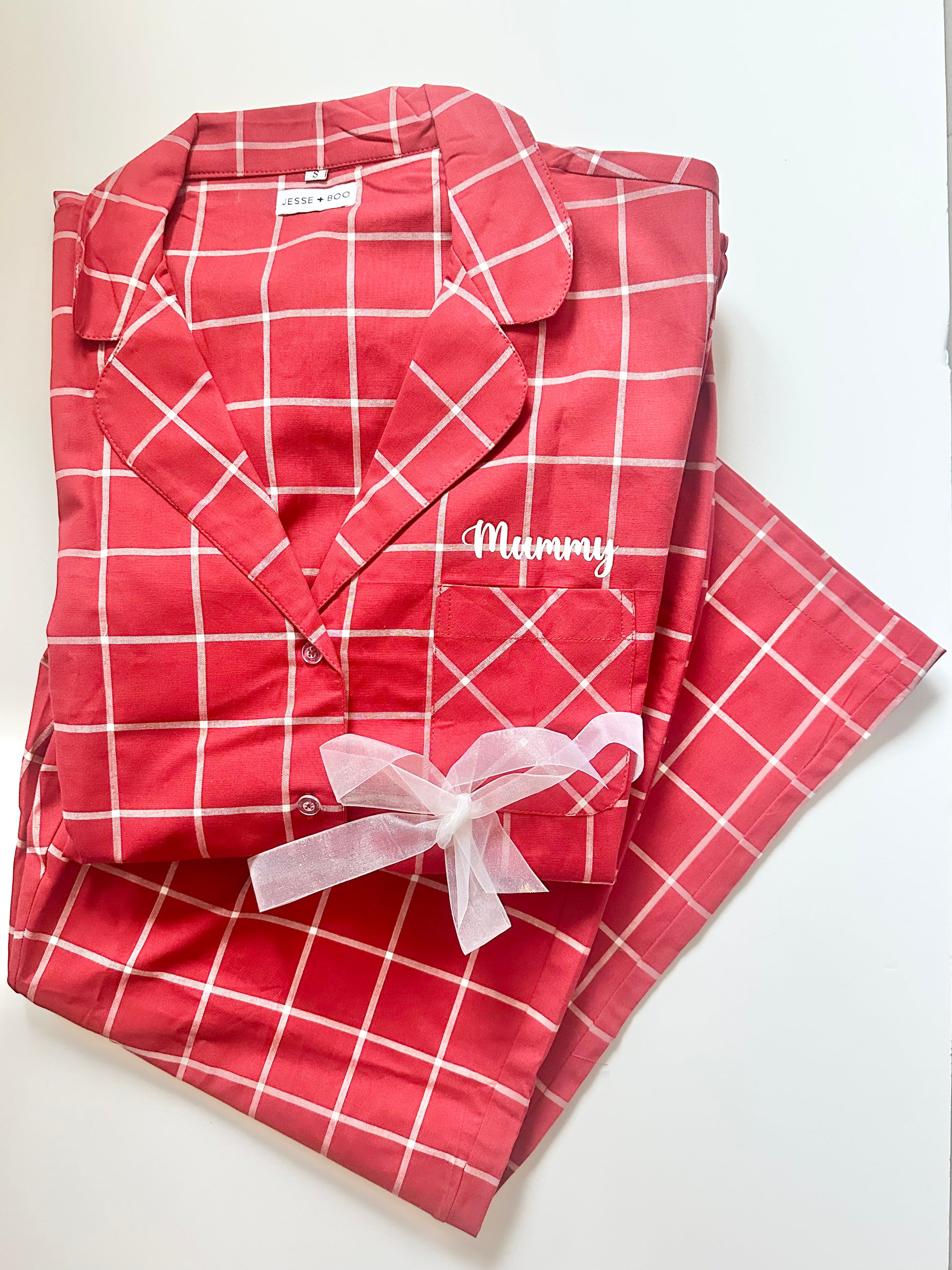 Family Matching PJs in Red/White Check with white sparkly personalisation