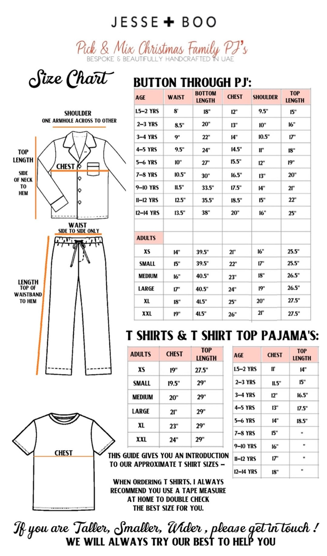 *To check your size, please lay an existing woven PJ top/shirt flat on the floor and with all buttons fastened.
